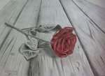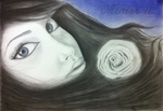 2013De wedergeboorte: ontdekking van iets nieuws dat alles verandert. Het heeft haar ogen geopend en ze kijkt met een nieuwe blik de wereld in. De witte roos symboliseert de ziel. Houtskool, potlood, grafiet, conté.